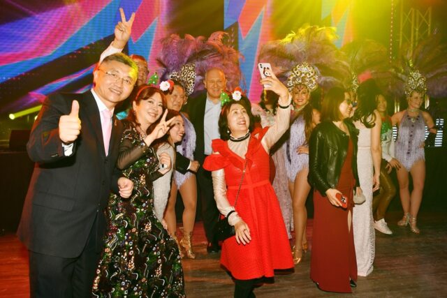 最后,异域风情的热舞表演点燃全场,舞者们走入观众席,带动台下嘉宾共同起舞。在热情洋溢的音乐与互动中,全场来宾纷纷加入,现场化作一片欢乐律动的海洋,为这个温馨而热烈的夜晚画上了圆满的句号。